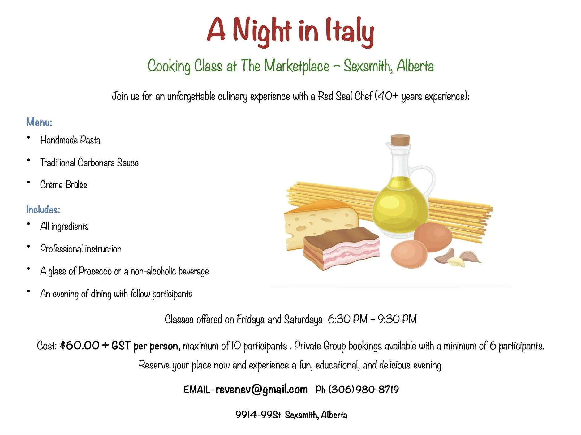 In addition to great food, The Marketplace now offers Italian-themed cooking classes, welcoming community members to learn, taste, and connect. The shop also showcases local artisan goods such as woodworking, stained glass, pottery, and beeswax creations. With upcoming events like Teen cooking camps and private gatherings in the works, The Marketplace is quickly becoming a warm and creative hub in Sexsmith, Alberta.